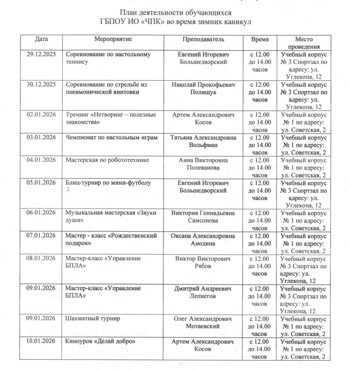 О деятельности ГБПОУ ИО "ЧПК" в период зимних каникул